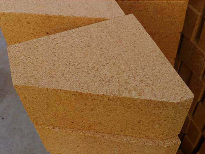 拱腳粘土磚是用50%的軟質(zhì)粘土和50%硬質(zhì)粘土熟料,按一定的粒度要求進行配料,經(jīng)成型、干燥后,在1300~1400℃的高溫下燒成。粘土耐火磚屬于弱酸性耐火制品,能抵抗酸性熔渣和酸性氣體的侵蝕,對堿性物質(zhì)的抵抗能力稍差。粘土磚的熱性能好,耐急冷急熱。