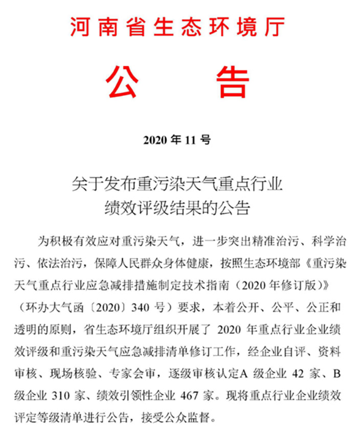 10月26日,在河南省生態(tài)環(huán)境廳印發(fā)了《關(guān)于發(fā)布重污染天氣重點(diǎn)行業(yè)績(jī)效評(píng)級(jí)結(jié)果的公告》(〔2020〕年11號(hào))中,鄭州榮盛窯爐耐火材料有限公司獲評(píng)“績(jī)效引領(lǐng)性企業(yè)”,這是繼公司榮獲“高新技術(shù)企業(yè)”、省級(jí)“科技型中小企業(yè)”后,再添喜訊。