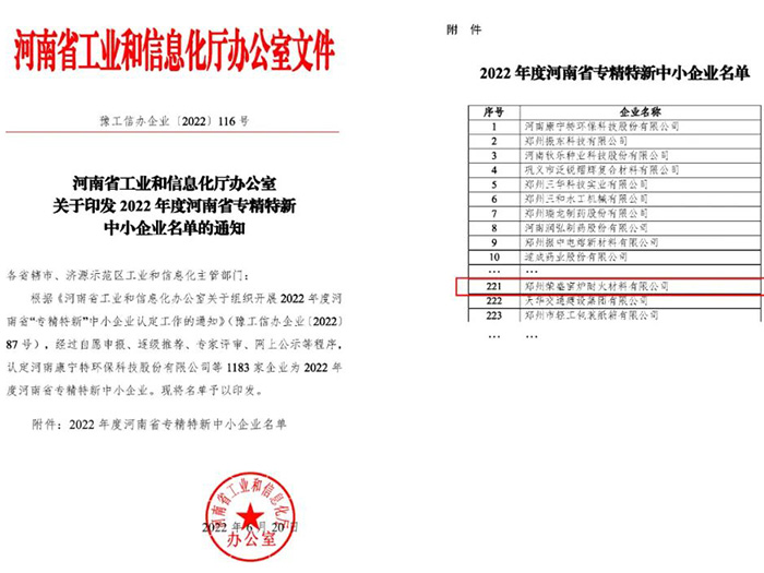 近日,河南省工業(yè)和信息化廳公布了《河南省工業(yè)和信息化廳辦公室關(guān)于印發(fā)2022年度河南省“專精特新”中小企業(yè)名單的通知》。經(jīng)省工業(yè)和信息化廳組織專家評審,鄭州榮盛窯爐耐火材料有限公司被認定為2022年度河南省“專精特新”企業(yè)。這是繼榮獲“國家高新技術(shù)企業(yè)”、“河南省科技型中小企業(yè)”后,榮盛耐材在科技創(chuàng)新領(lǐng)域獲得的又一殊榮。