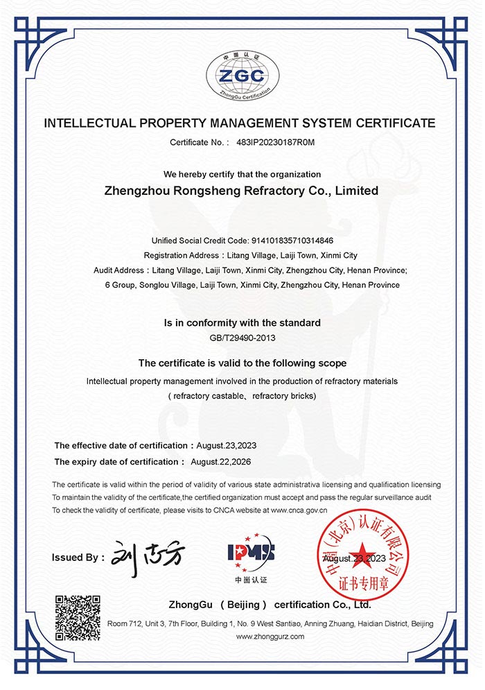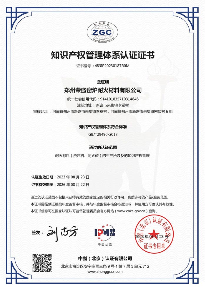 發(fā)布時間:2023/8/24 11:49:46 點擊率: 來源:高鋁磚廠家 作者:榮盛耐材近日,鄭州榮盛窯爐耐火材料有限公司(以下簡稱「榮盛耐材」)順利通過國家知識產(chǎn)權(quán)貫標(biāo)認證,并獲得了《知識產(chǎn)權(quán)管理體系認證證書》中英文雙語認證。該項認證的順利通過,標(biāo)志著榮盛耐材構(gòu)建了一套規(guī)范化、系統(tǒng)化、程序化、精細化的知識產(chǎn)權(quán)管理體系。