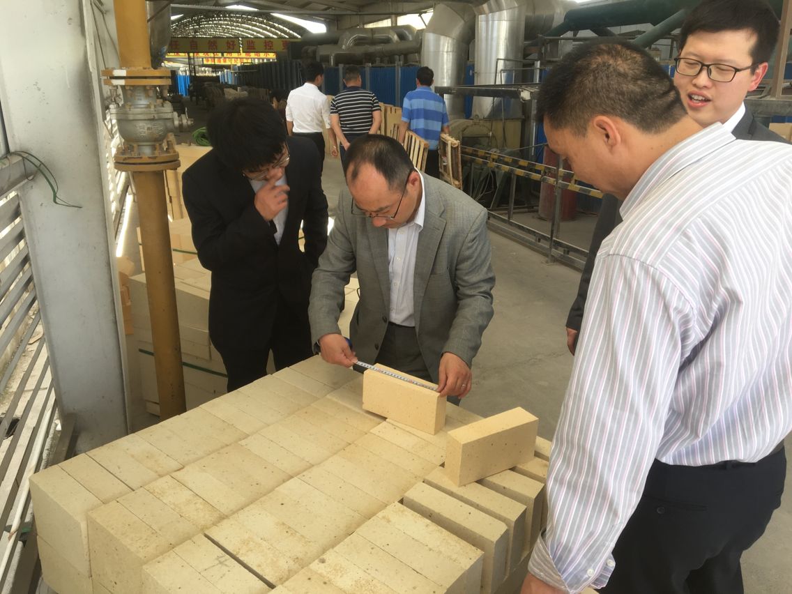 考察團(tuán)檢測(cè)榮盛耐材生產(chǎn)的鎂鉻磚